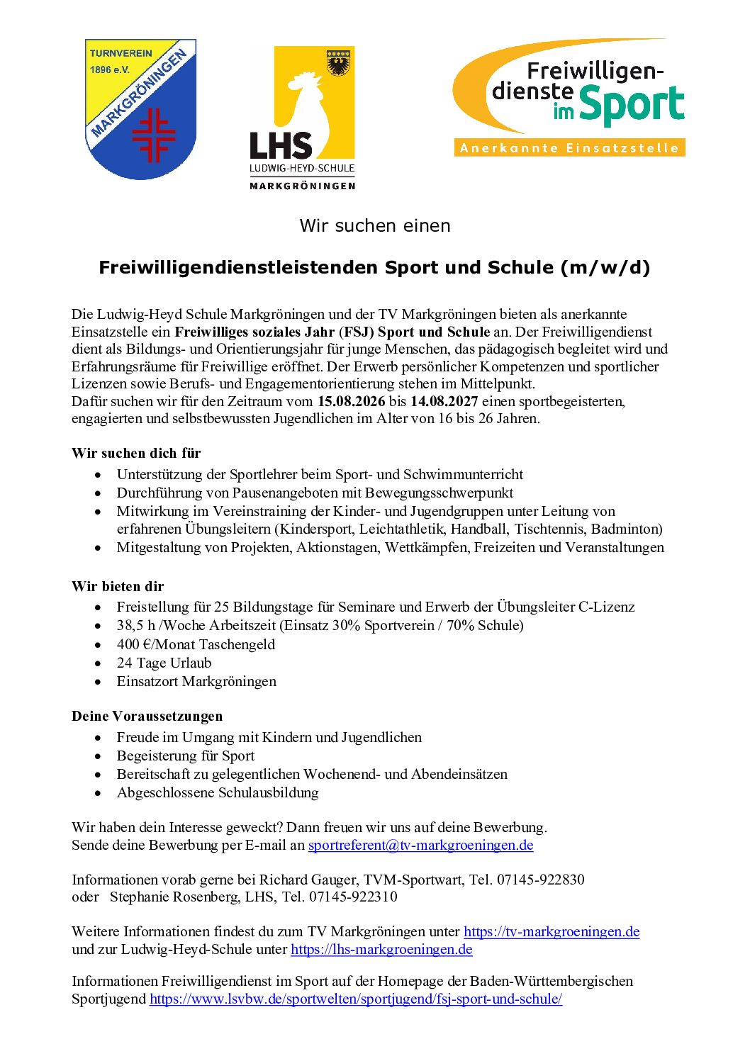 01 Dez. Wir suchen einen Freiwilligendienstleistenden Sport und Schule (m/w/d)!